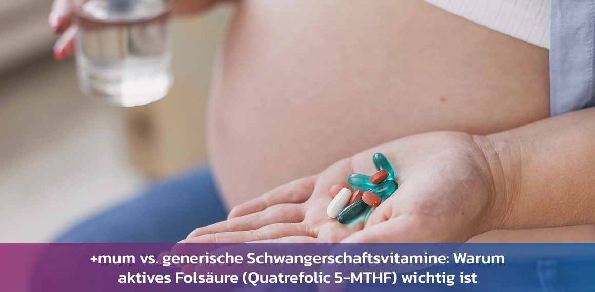+mum verwendet Quatrefolic 5-MTHF, eine aktive Form von Folsäure, die der Körper sofort verwerten kann. Es ist keine Umwandlung erforderlich, es gibt keinen enzymatischen Engpass und es besteht keine Abhängigkeit von der individuellen Stoffwechseleffizienz.